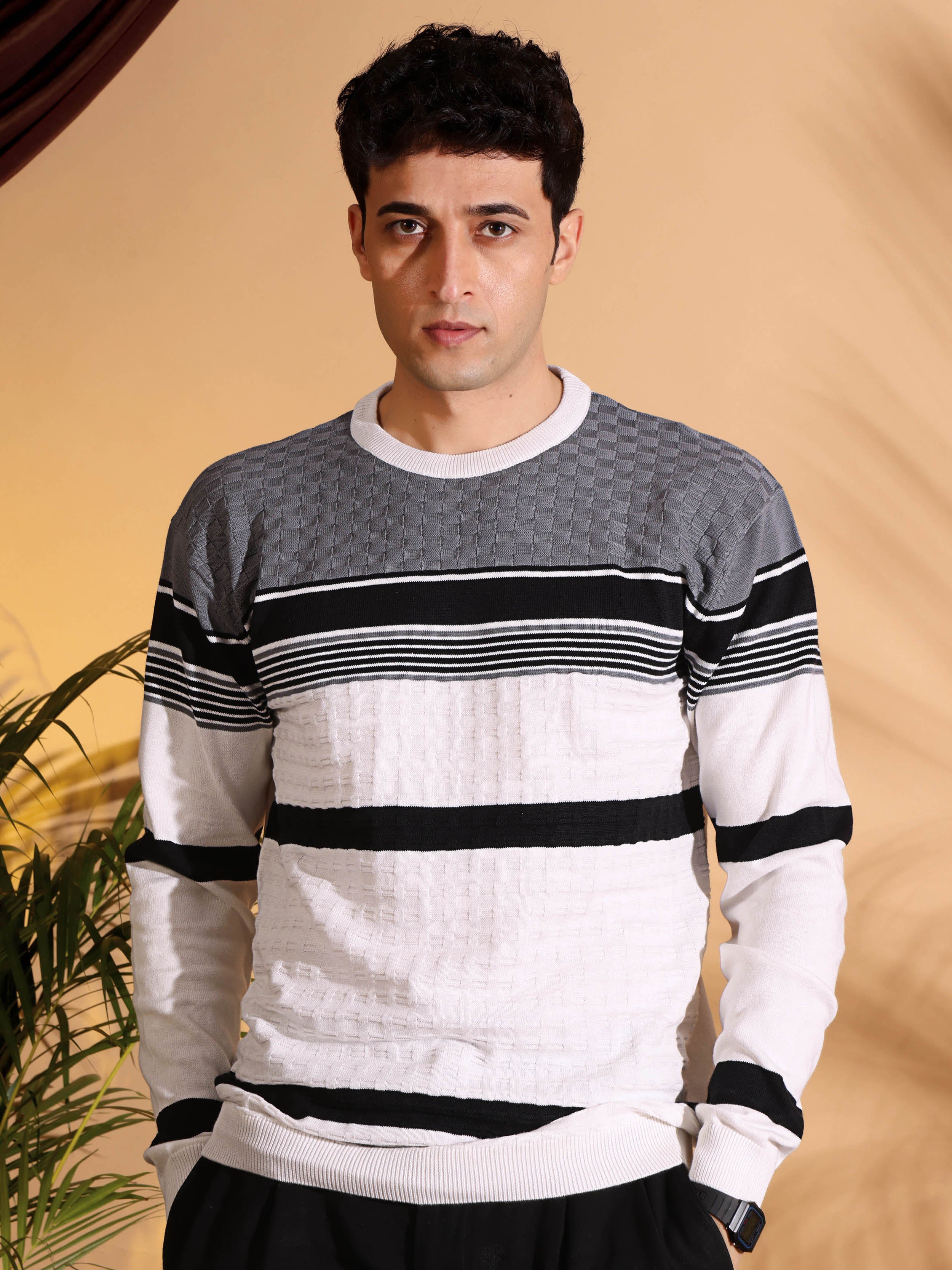 This White Self Structured Box Slim Fit Knitted T-Shirt is made from 100% cotton, offering superior breathability and softness for all-day comfort. Its finely knitted fabric provides a smooth texture and durability, while the slim fit cut sharpens your shape for a sleek, modern appearance. The vibrant yellow stripes create a stylish statement, making this T-shirt a versatile addition to both casual and smart-casual wardrobes.